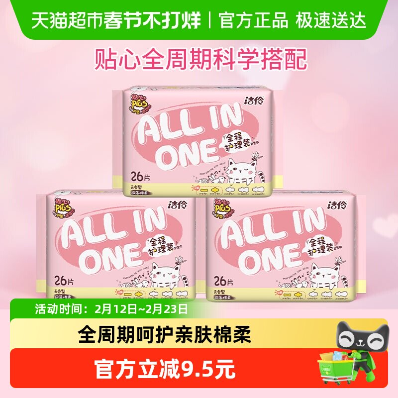 洗护清洁剂/卫生巾/纸/香薰 洁伶全程护理少女卫生巾超薄棉柔日夜用组合3包78片