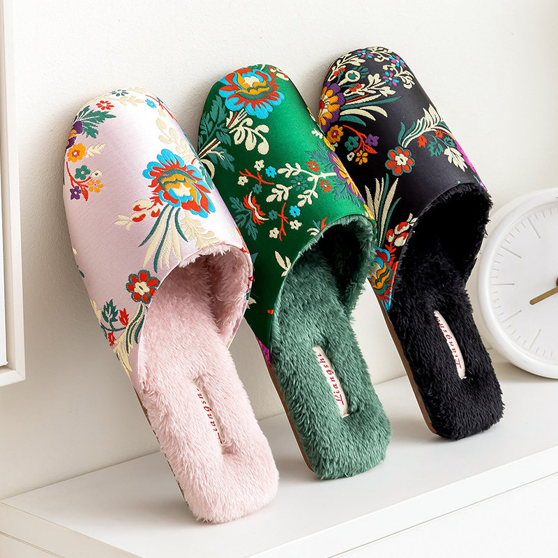 居家布艺 国风家居新中式绸缎刺绣女士冬款保暖防滑办公室室内居家地板拖鞋