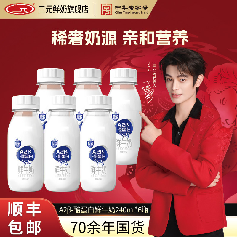 咖啡/麦片/冲饮 [百亿补贴]三元A2β酪蛋白鲜牛奶240ml巴氏杀菌早餐奶低温生牛乳