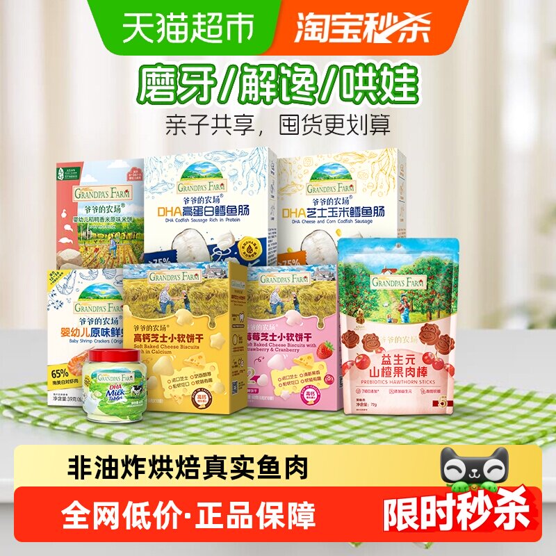 婴童食品 爷爷的农场婴幼儿磨牙米饼DHA鳕鱼肠零食肉肠软饼山楂棒宝宝零食