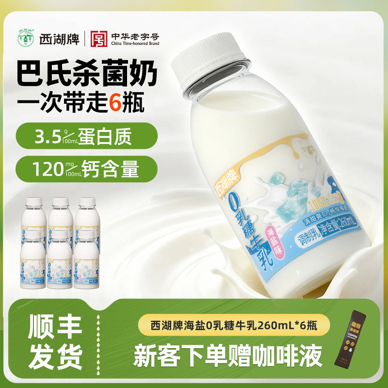 咖啡/麦片/冲饮 西湖牌海盐0乳糖牛奶260mL*6瓶新鲜低温营养早餐奶无乳糖不耐受