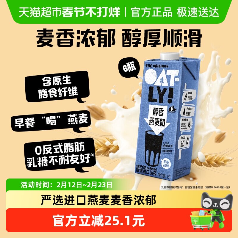 咖啡/麦片/冲饮 OATLY醇香燕麦奶1L*6整箱囤货植物蛋白饮料0乳糖高钙营养早餐奶