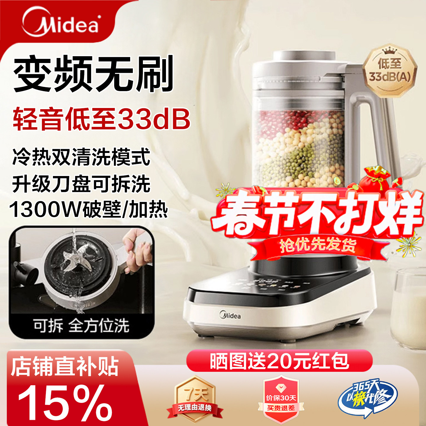 厨房电器 美的安睡破壁机家用多功能低音柔声豆浆机可拆洗全自动料理烹饪机