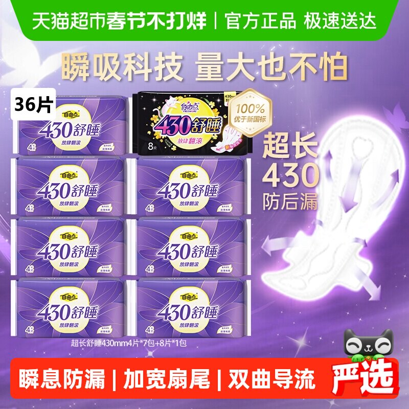 洗护清洁剂/卫生巾/纸/香薰 【优于新国标】自由点卫生巾超长舒睡430mm夜用36片姨妈巾