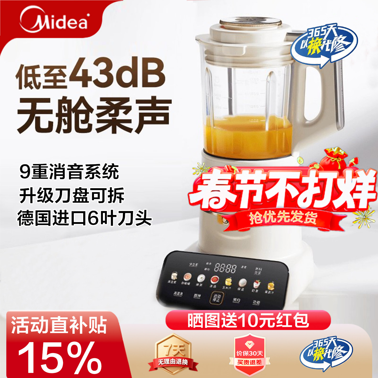 厨房电器 美的无罩安睡破壁机柔音豆浆机家用大容量料理机榨汁机刀盘可拆新