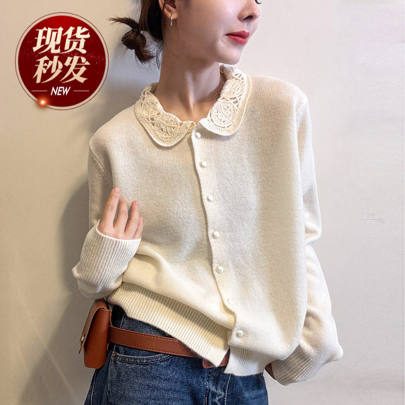 女装/女士精品 镂空钩花翻领羊毛针织开衫女欧洲站2025冬装新款欧货女装打底衫潮