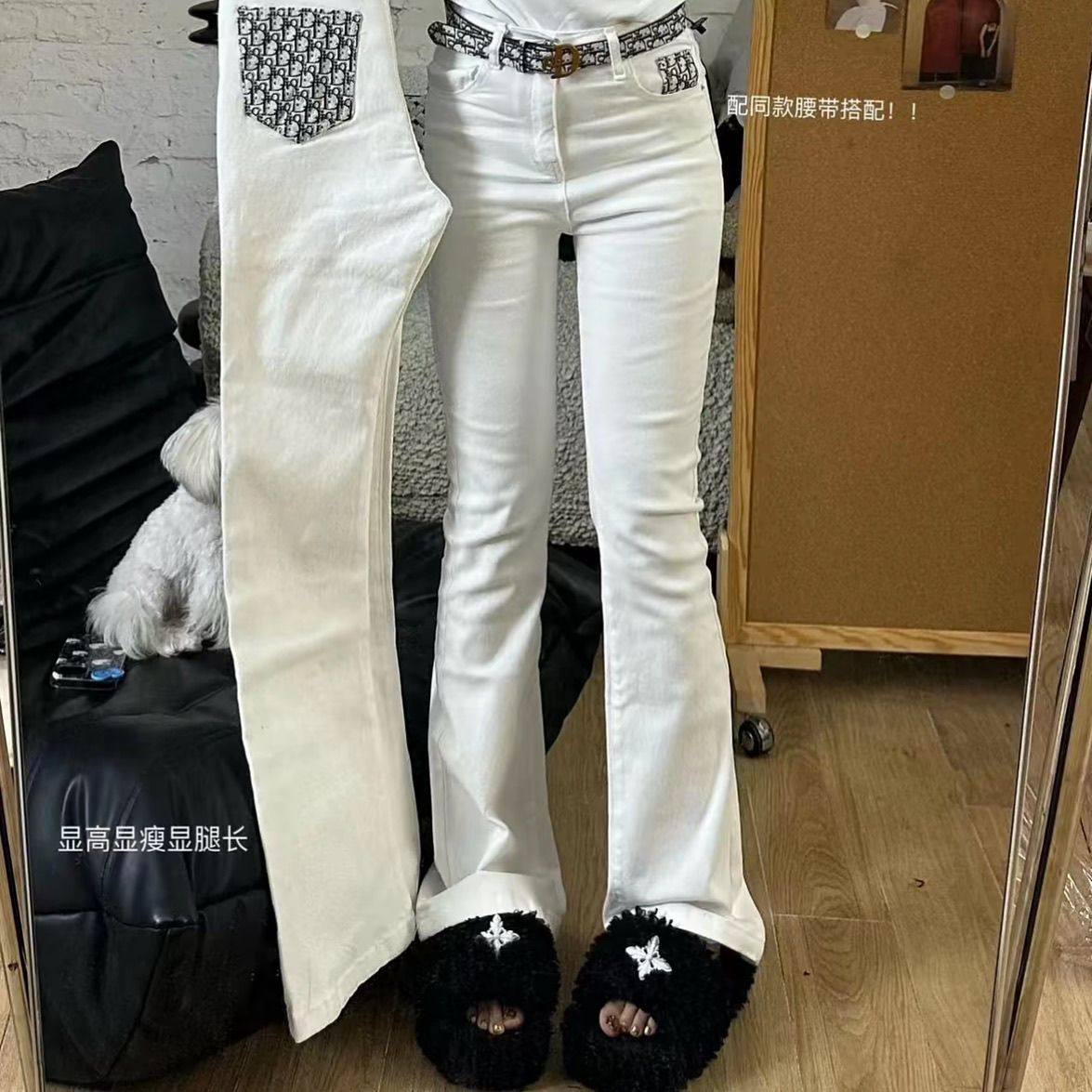 女装/女士精品 2025春秋新款网红同款字母提花皮兜拼接高腰显瘦微喇牛仔裤长裤潮