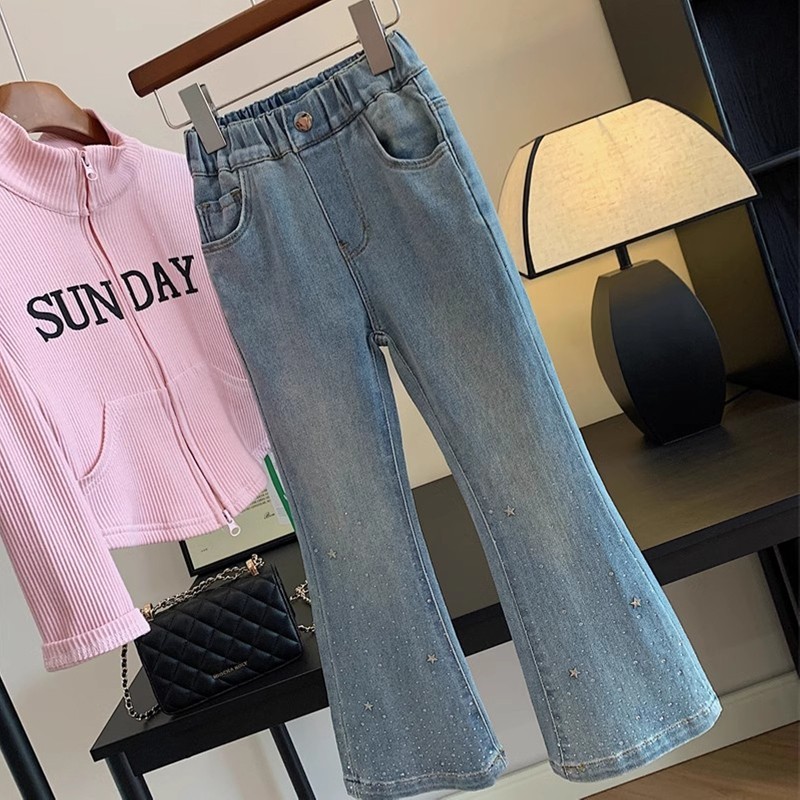 童装/婴儿装/亲子装 女童春秋冬季新款中大童加绒微喇裤童装儿童一体绒加厚牛仔喇叭裤