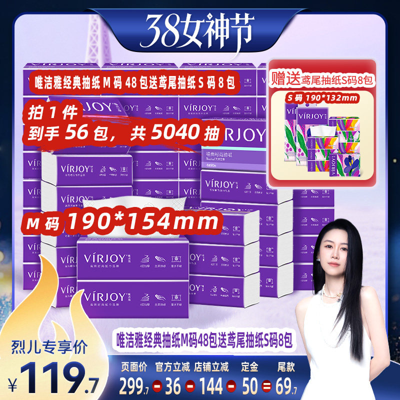 洗护清洁剂/卫生巾/纸/香薰 【先加购!24号烈儿0元付定】唯洁雅经典抽纸M码4层90抽48包