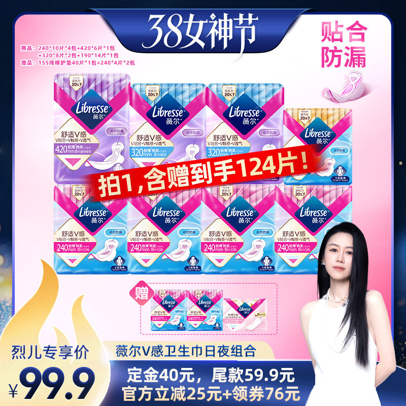 洗护清洁剂/卫生巾/纸/香薰 【先加购!24号烈儿0元付定】薇尔v感卫生巾超薄透气防漏124片