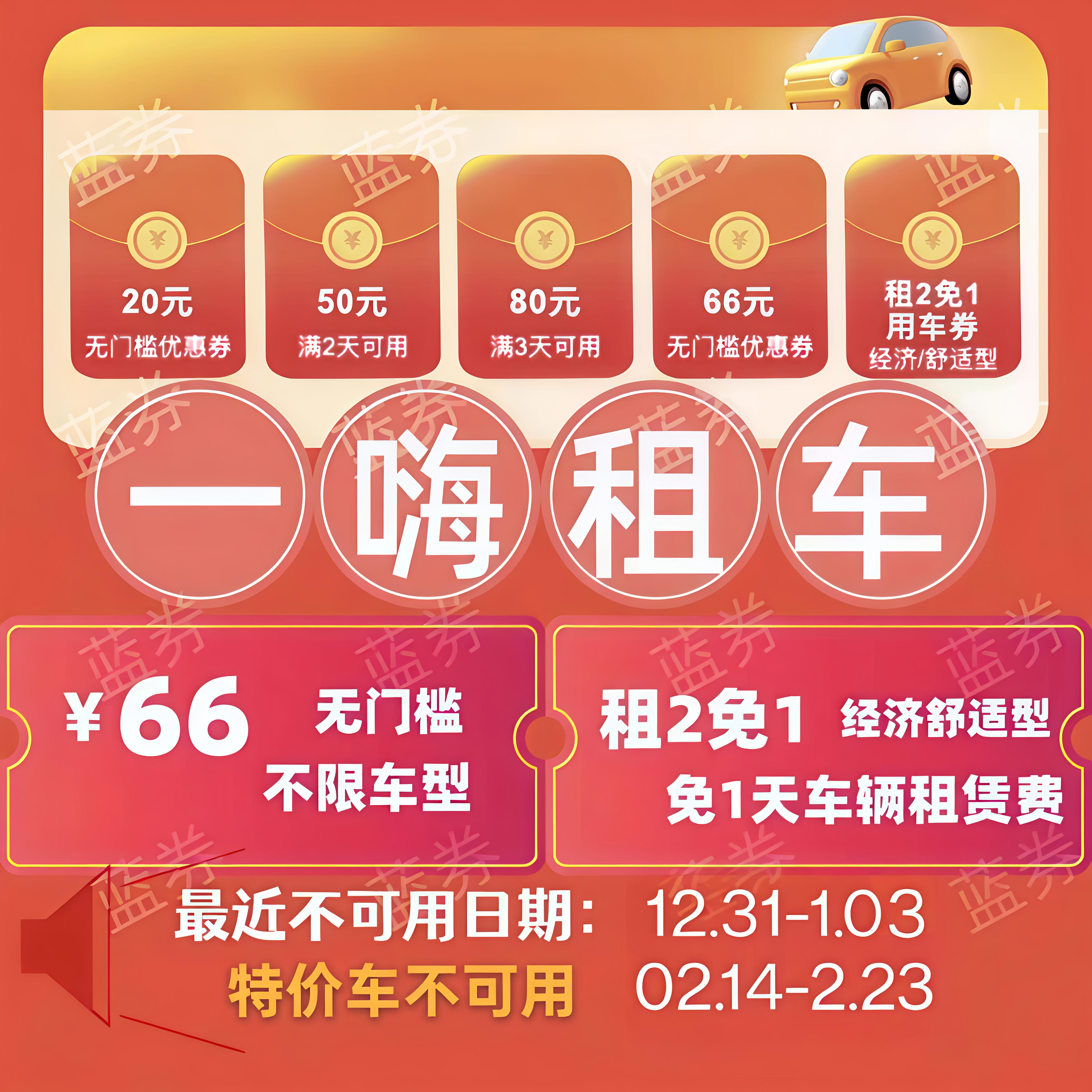 购物提货券 自动发货一嗨租车66无门槛优惠券经济舒适租1送1直充
