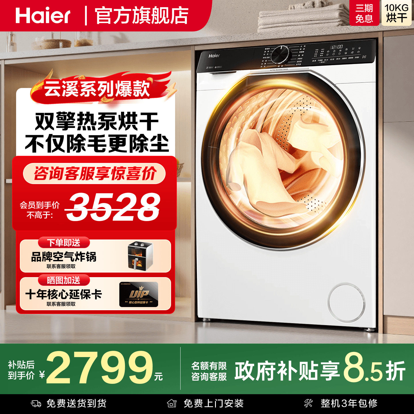 大家电 [云溪4.0]海尔热泵烘干机77E家用双擎变频10KG干衣机官方旗舰统帅