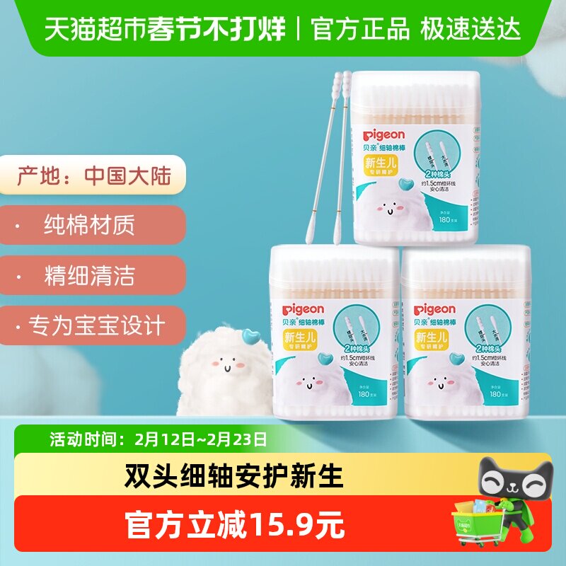 婴童用品 Pigeon贝亲 宝宝棉棒婴儿细轴棉签180支*3盒棉花棒 儿童清洁用品