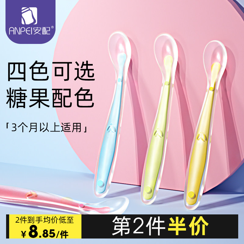 婴童用品 安配婴儿勺子新生儿宝宝吃饭米糊辅食软头弯头勺儿童餐具硅胶软勺