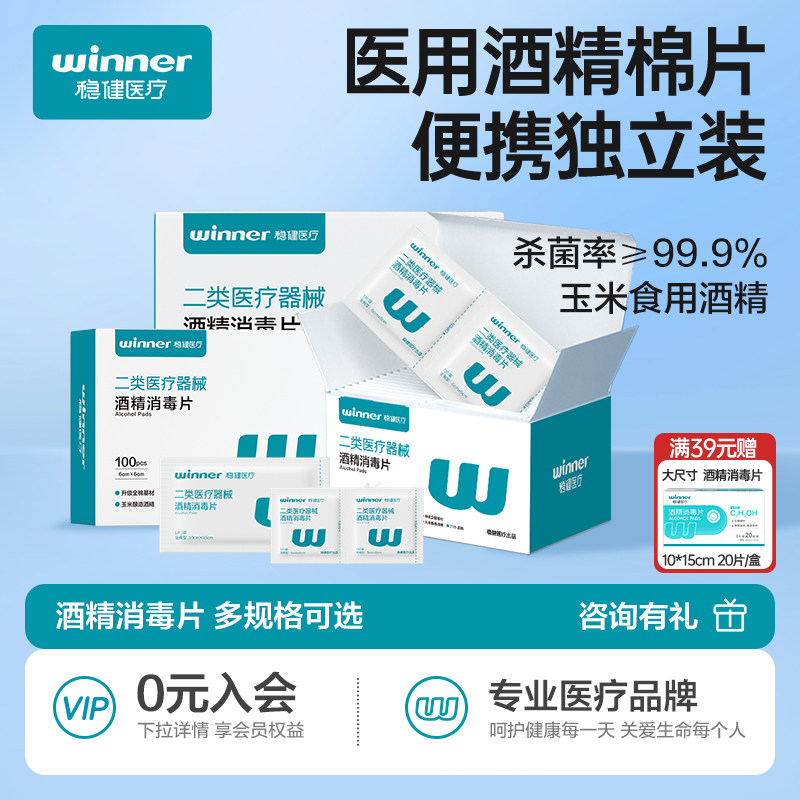 医疗器械 稳健医用酒精棉片100片一次性消毒片消毒棉贴擦手机屏幕清洁湿巾