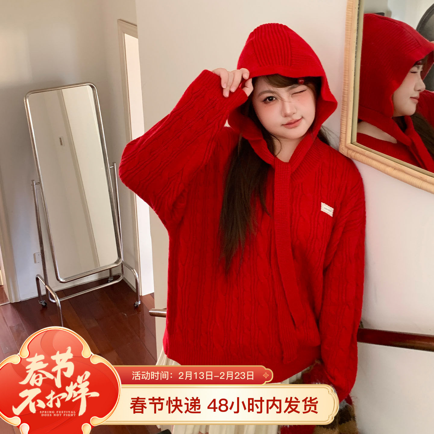 女装/女士精品 YUZI鱼子蝴蝶结麻花毛衣红色带帽上衣宽松休闲百搭针织衫大码女装
