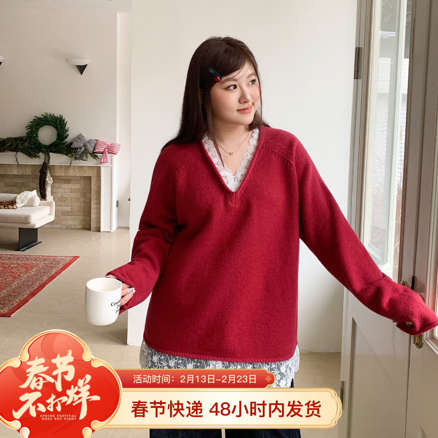 女装/女士精品 YUZI鱼子假两件蕾丝花边毛衣V领宽松慵懒甜美温柔红/蓝色大码女装