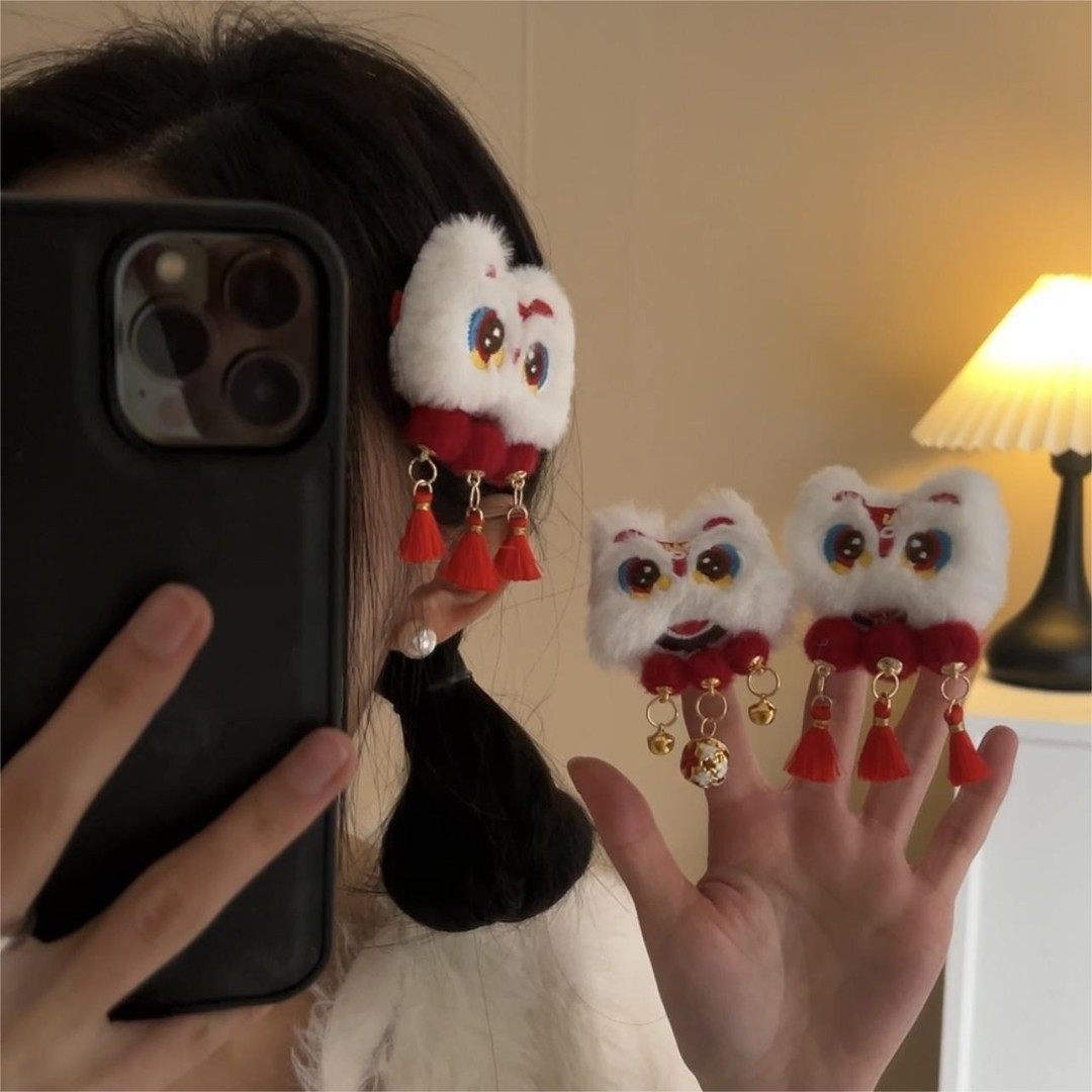 饰品/流行首饰/时尚饰品新 爆款2026年新年醒狮流苏发夹女碎发鸭嘴夹双丸子头侧边刘海夹头饰