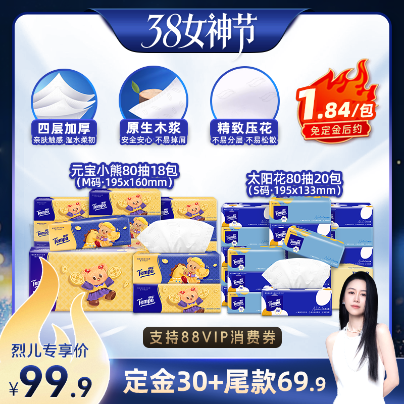洗护清洁剂/卫生巾/纸/香薰 【先加购!24号烈儿0元付定】得宝软抽纸巾38包元宝小熊+太阳花