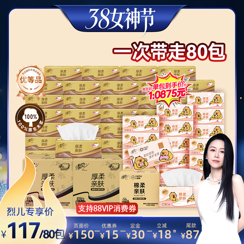 洗护清洁剂/卫生巾/纸/香薰 【先加购!24号烈儿0元付定】清风云柔60包M码+卡皮巴拉90抽20包