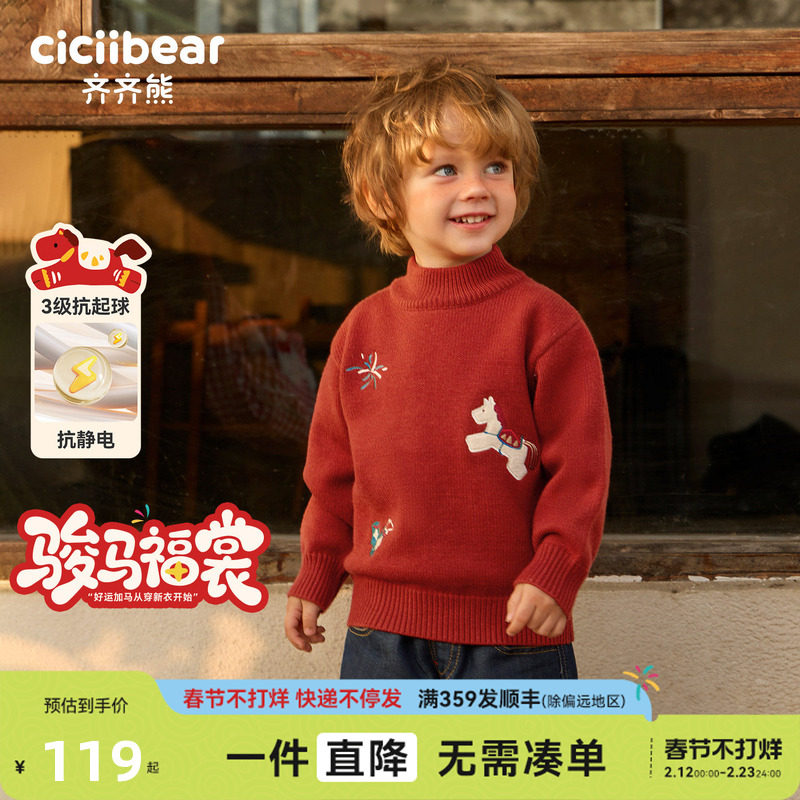 童装/婴儿装/亲子装 [半拉链力安同款]齐齐熊宝宝毛衣冬款男童红色儿童新年服马年童装