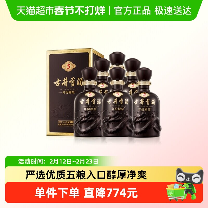 酒类 古井贡酒年份原浆古5-55°500ml*6瓶高度浓香型白酒整箱