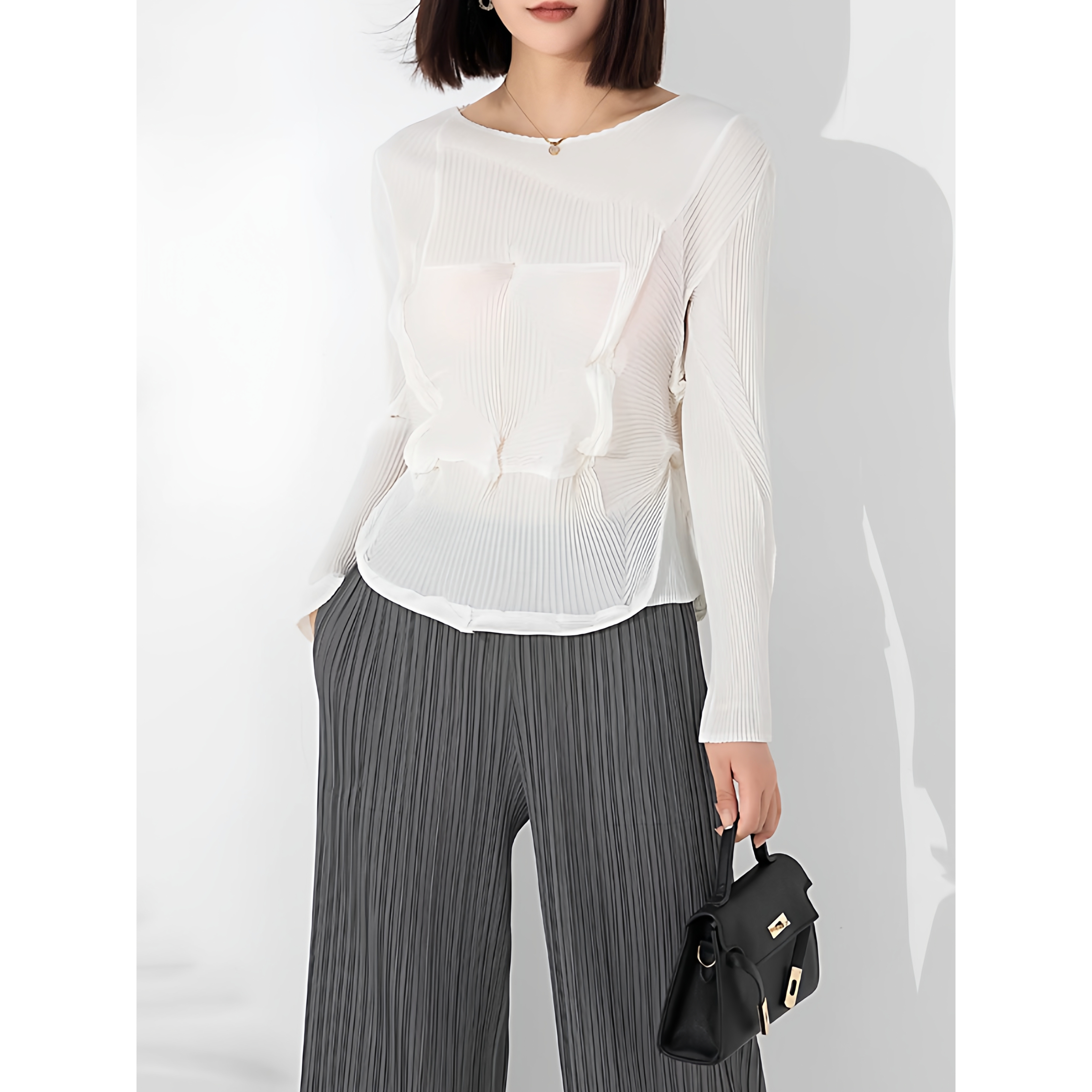 女装/女士精品 【海外代購】三宅褶皱打底衫气质休闲通勤花苞圆领长袖上衣