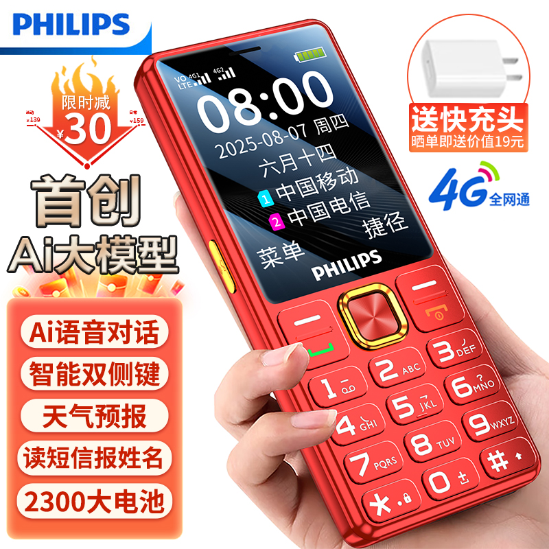 手机 [官方旗舰店]飞利浦2025年新款老年机全网通4G正品超长待机老人机大屏大字大声音男女电信版学生手机按键机