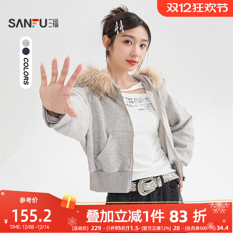 女装/女士精品 三福开衫卫衣2025新款冬季街潮可拆卸毛领宽松连帽外套女装511961