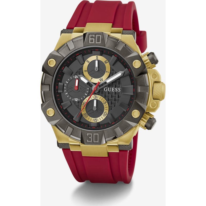 手表 代购GUESS男士腕表计时日期夜光多时区红色金属防水硅胶带运动休