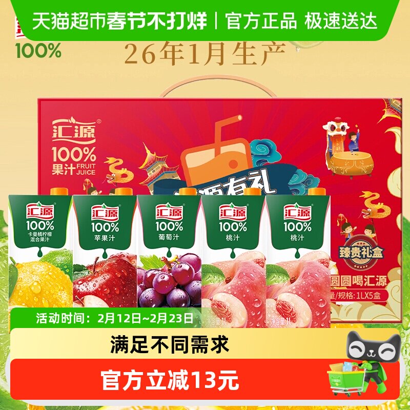 咖啡/麦片/冲饮 汇源果汁100%臻贵礼盒1L*5盒4口味纯果汁苹果桃柠檬葡萄年货