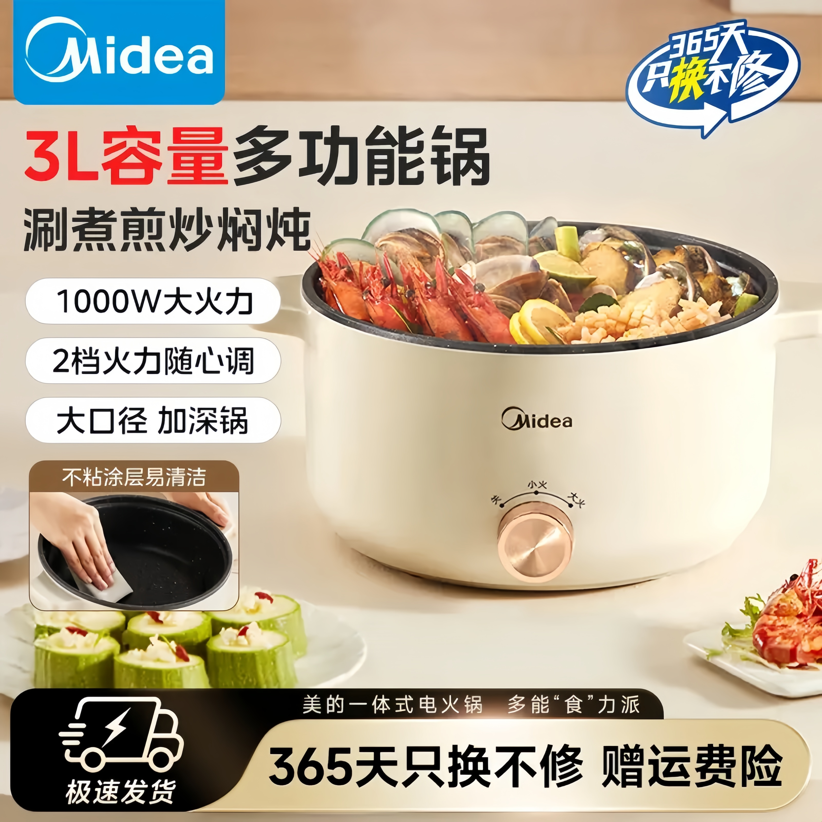 厨房电器 美的电煮锅3L小型家用多功能不沾炒锅单人学生宿舍泡面一体电火锅