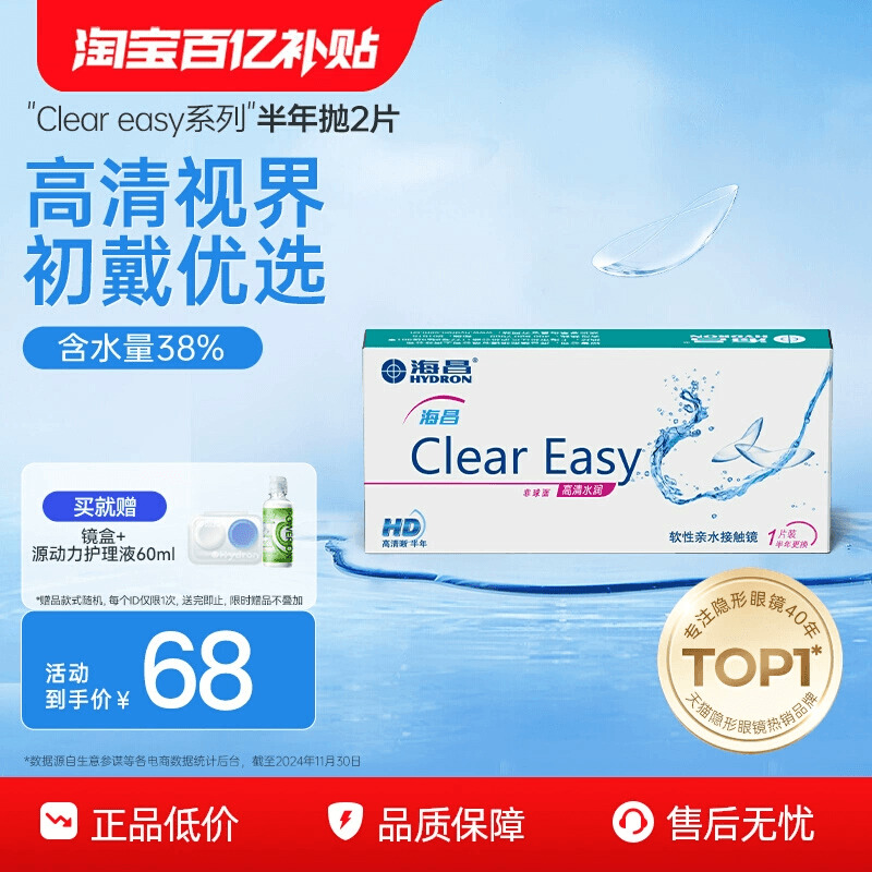 隐形眼镜/护理液 【百亿补贴】海昌隐形眼镜半年抛水凝胶近视透明高清2片