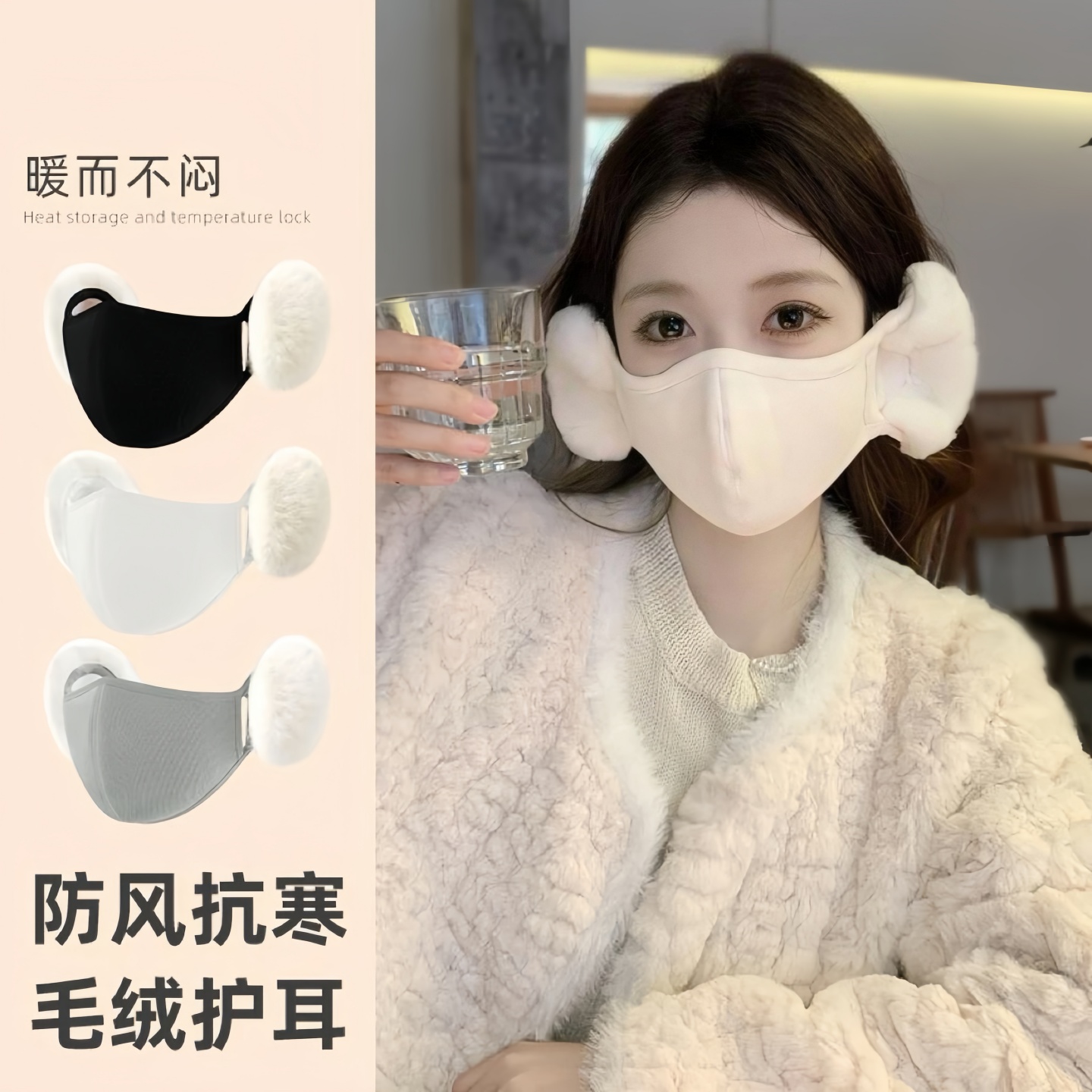 居家日用 冬季保暖口罩耳罩二合一云朵毛绒可爱护耳立体显瘦面罩透气防寒耳