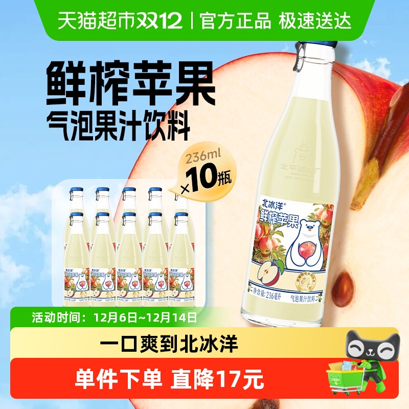 咖啡/麦片/冲饮 北冰洋20%鲜榨苹果汁气泡水饮料鲜果压榨果汁饮料236ml*10瓶