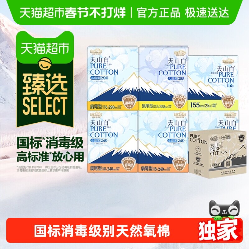 洗护清洁剂/卫生巾/纸/香薰 臻选 淘淘氧棉天山白消毒级扇尾纯棉卫生巾日夜组合60片