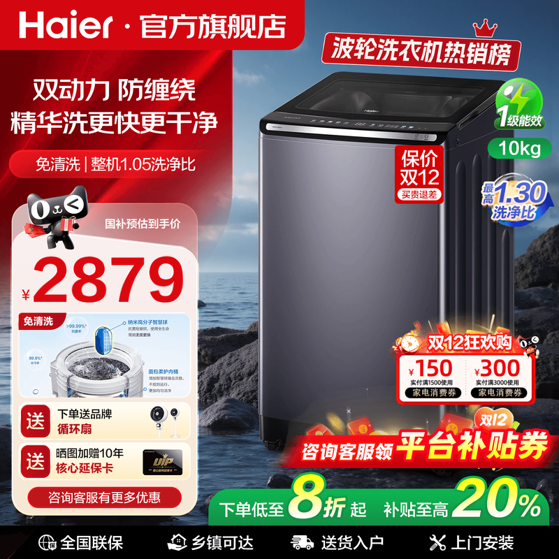 大家电 [云溪新款]海尔双动力波轮洗衣机10kg全自动家用直驱免清洗70E