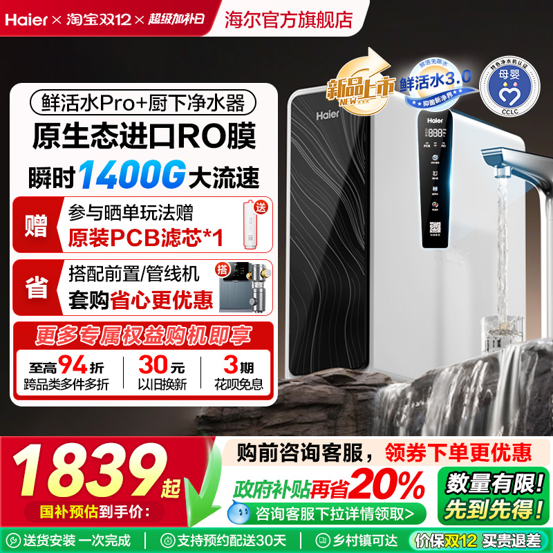 厨房电器 【政府补贴】海尔鲜活水pro+1200G净水器家用直饮厨卫净饮机R881