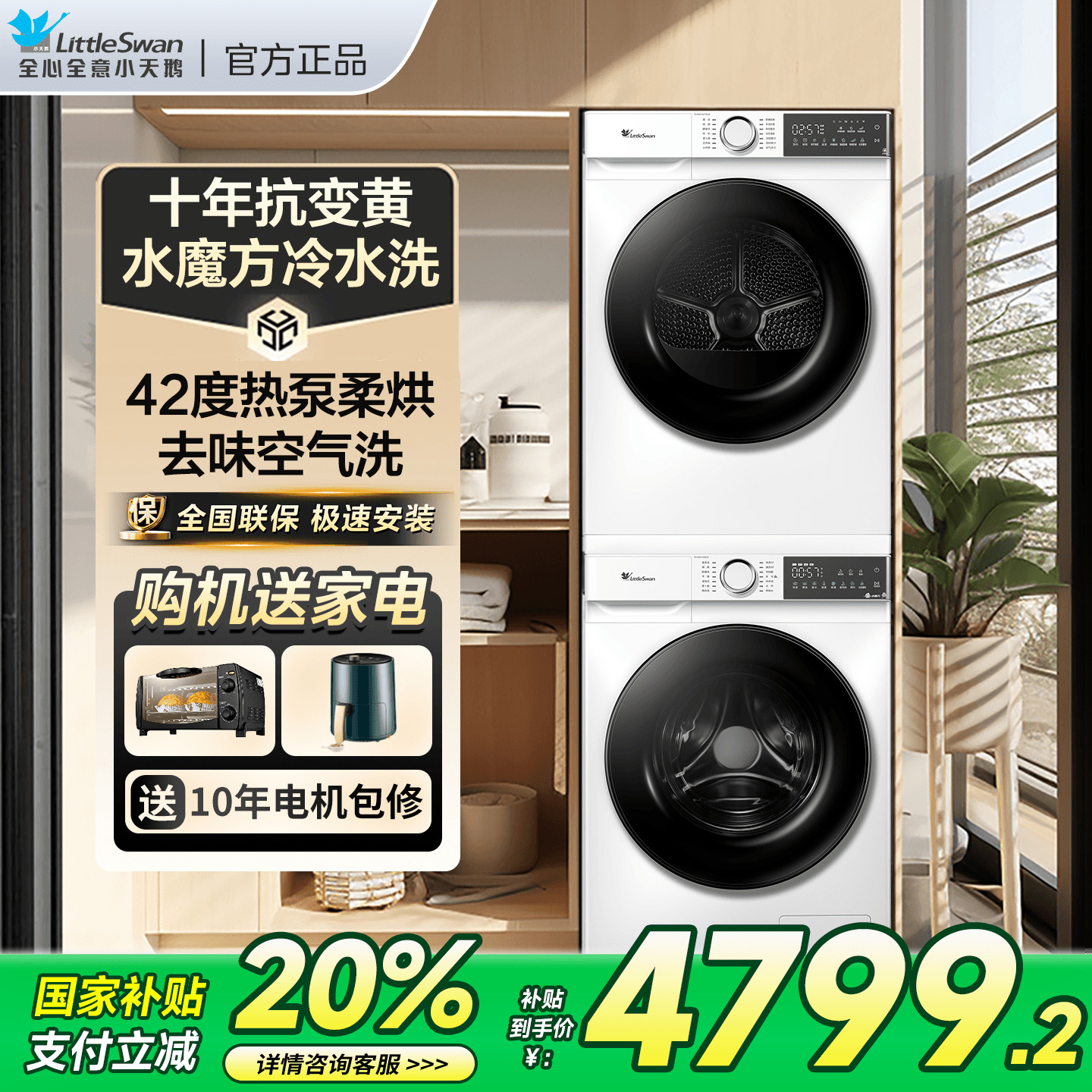 大家电 【超级补贴,低价暴击】小天鹅洗烘套装洗衣机干衣机186+135官方