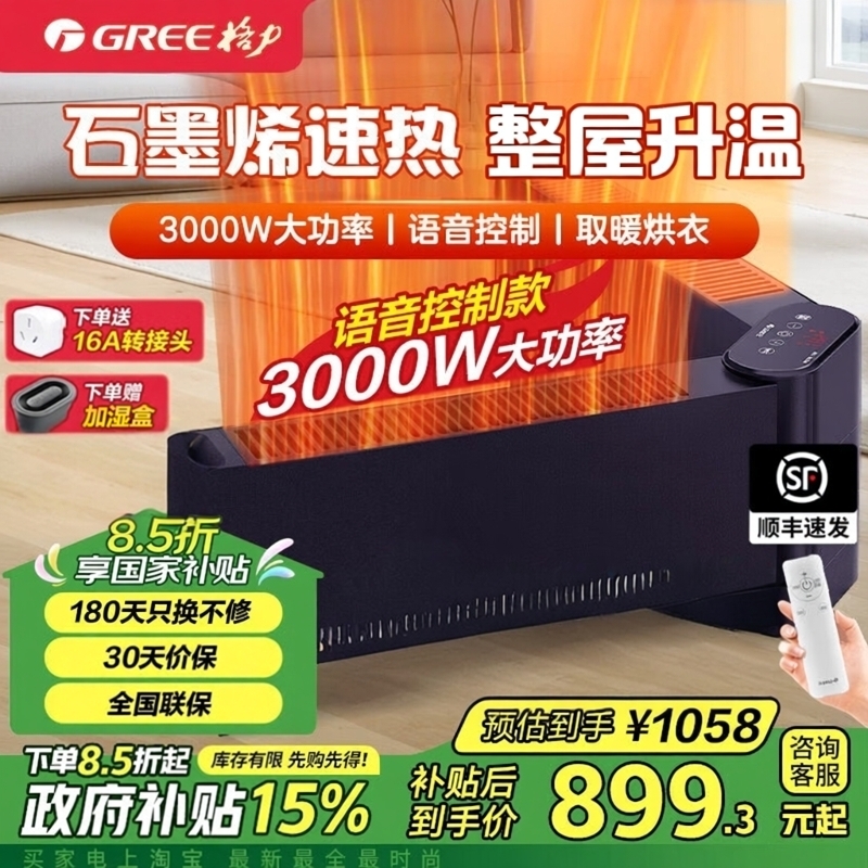 生活电器 格力取暖器踢脚线石墨烯卧室3000W大功率浴室防水NDJD-S7030BV