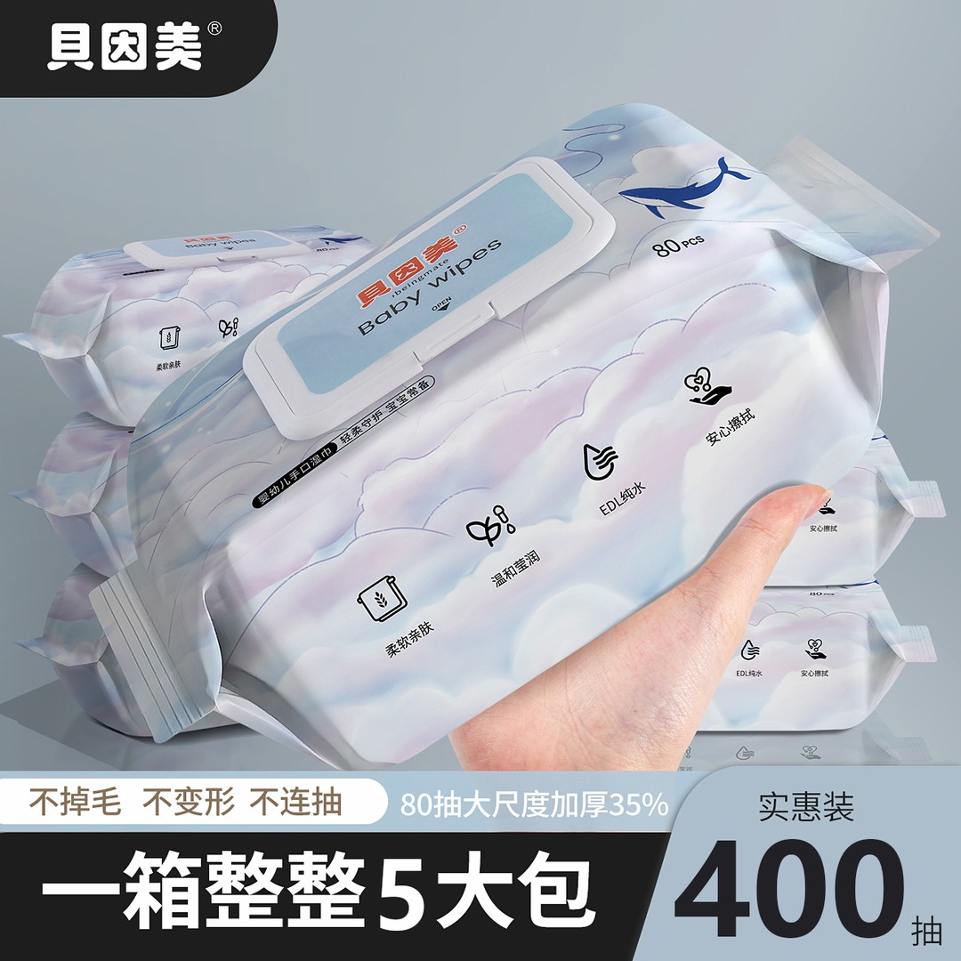 洗护清洁剂/卫生巾/纸/香薰 贝因美新生婴儿手口专用湿巾宝宝幼儿童80抽*5大包实惠加厚湿纸巾