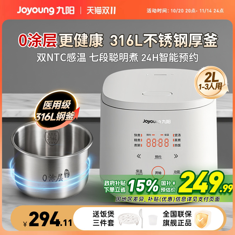 厨房电器 九阳0涂层迷你电饭煲政府补贴2L小型电饭锅316L不锈钢胆2025新款