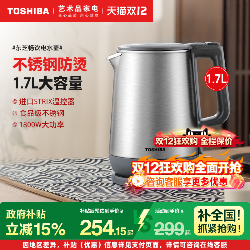 厨房电器 东芝电热水壶食品级不锈钢家用煮水烧水全自动双钢防烫一体开水壶
