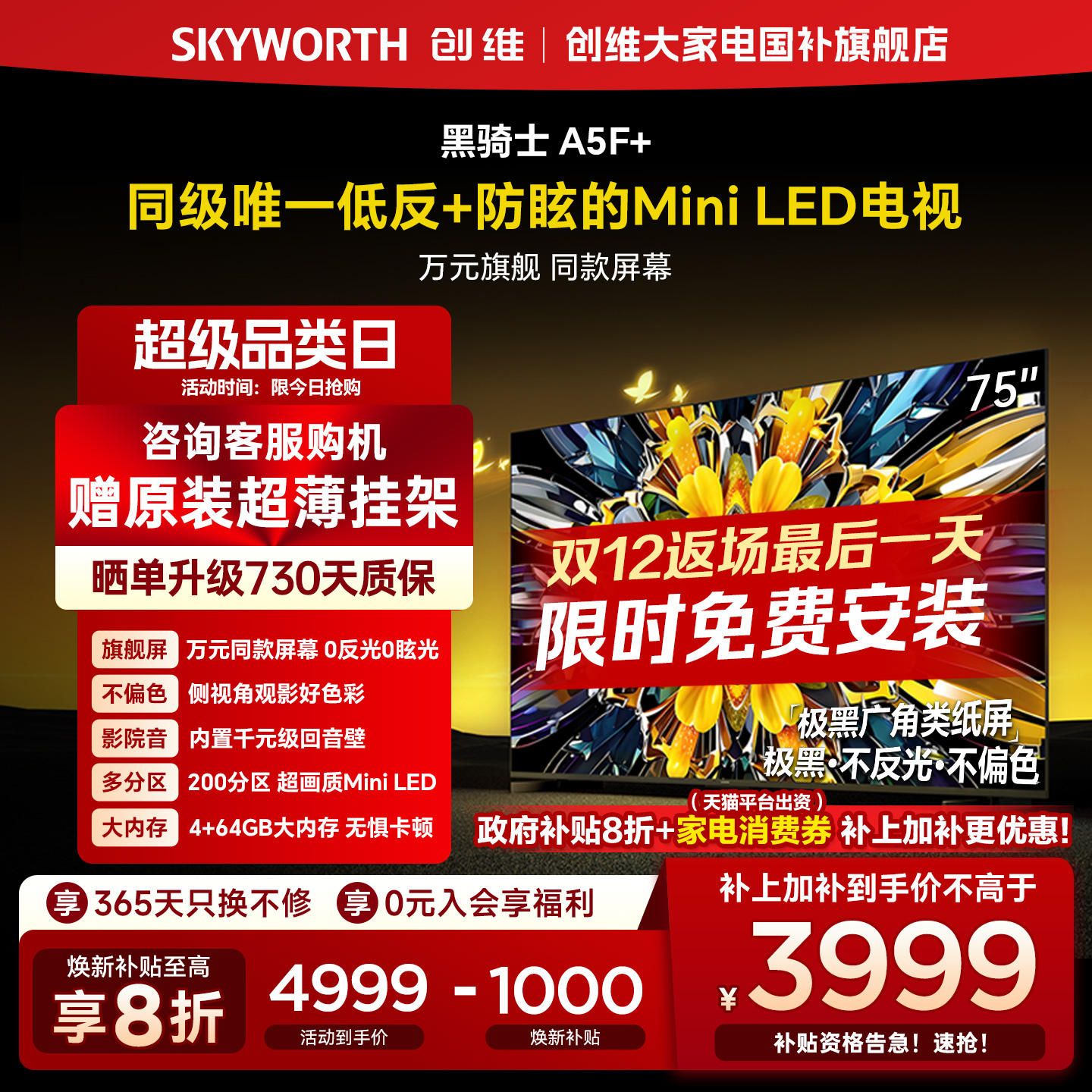 大家电 创维黑骑士A5F+ 75英寸Mini LED极黑类纸屏电视机 以旧换新补贴