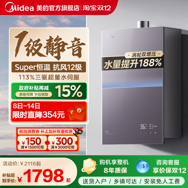 大家电 [政府补贴]美的安睡M9Rmax燃气热水器16升静音家用天然气恒温增压