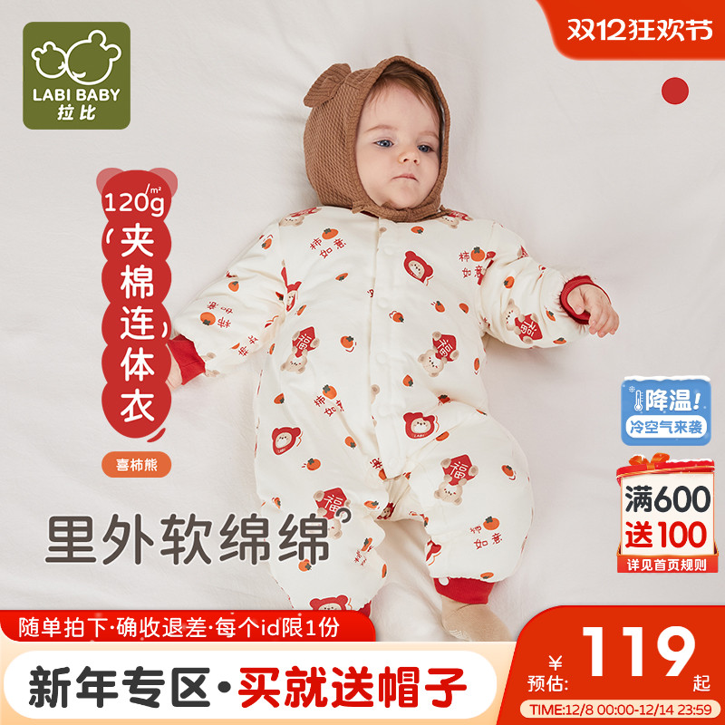 童装/婴儿装/亲子装 拉比婴儿哈衣25冬新品宝宝连体衣婴儿120g夹棉加厚保暖红色连体衣