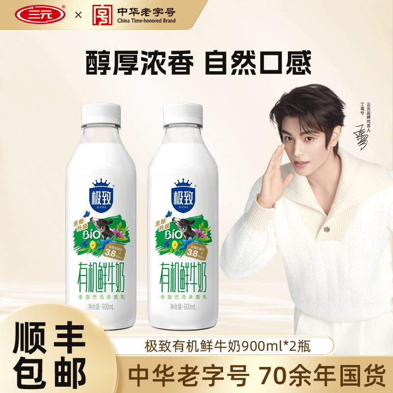 咖啡/麦片/冲饮 [百亿补贴]三元有机鲜牛奶900ml*2瓶装奶生牛乳低温早餐冷藏牛奶