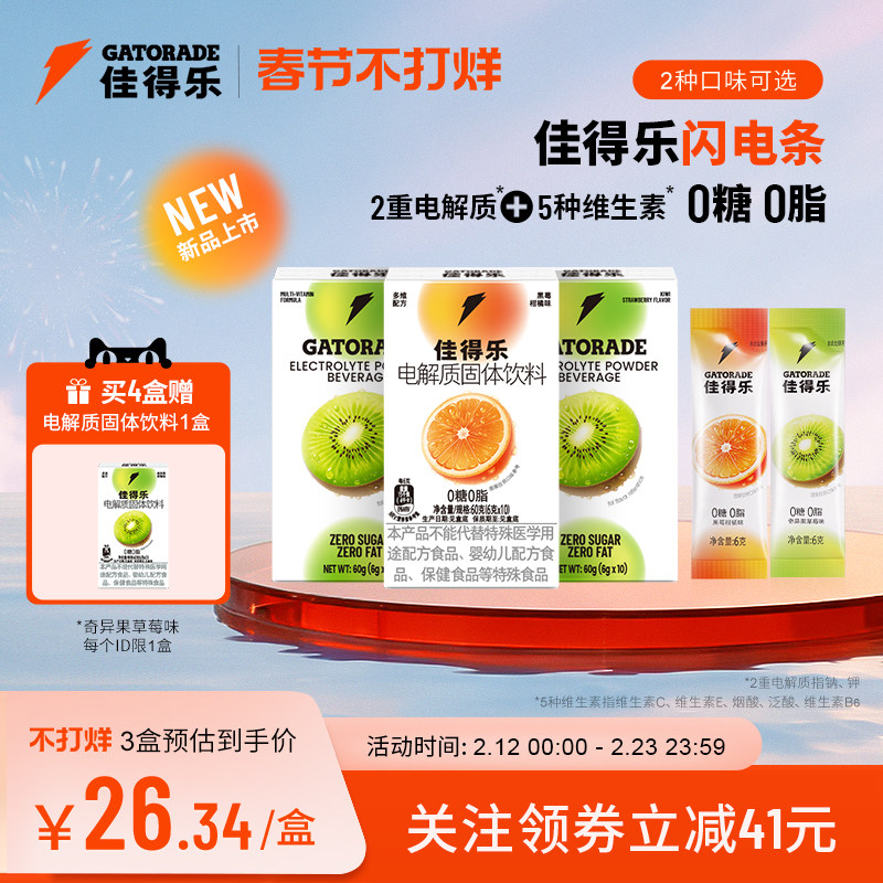 咖啡/麦片/冲饮 佳得乐闪电条电解质固体饮料运动补水冲剂维生素钠钾0糖0脂多盒装