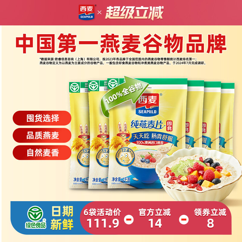 咖啡/麦片/冲饮 西麦纯燕麦片1kgX6袋即食冲饮高蛋白0添加蔗糖高膳食纤维懒人代餐