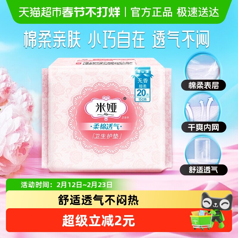 洗护清洁剂/卫生巾/纸/香薰 【包邮】洁云 米娅超柔卫生巾护垫150MM*20片棉柔透气超薄姨妈巾